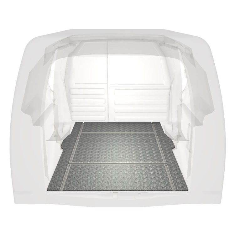 Lett og robust varebilgulv med tverrgående skinner til Citroën Berlingo / Peugeot Partner med sklisikker tråplate i aluminium og lastskinner (langsgående og tverrgående) for rask og sikker installasjon av hyllesystemer og tilbehør.