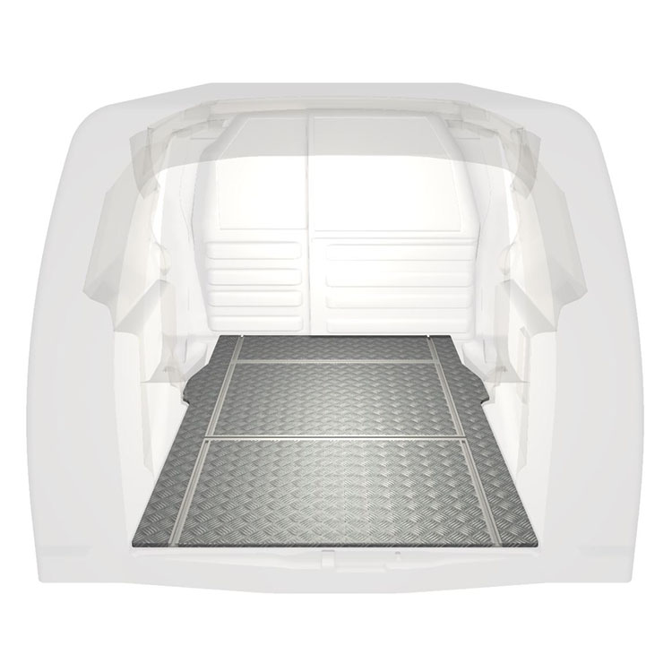 Lett og robust varebilgulv med tverrgående skinner til Citroën Berlingo / Peugeot Partner med sklisikker tråplate i aluminium og lastskinner (langsgående og tverrgående) for rask og sikker installasjon av hyllesystemer og tilbehør.
