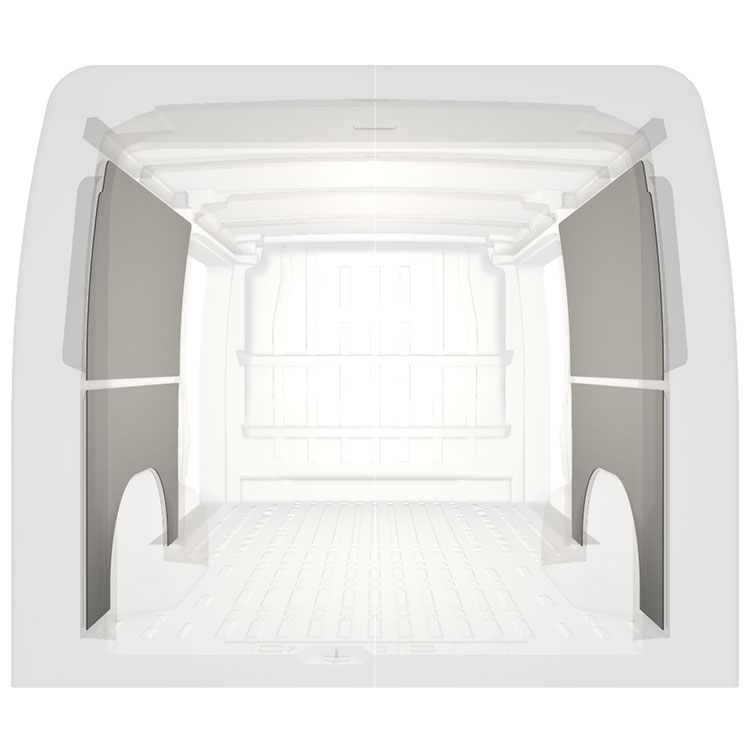 Lett prefabrikkertkledning til innerveggene i Citroën Jumper / Peugeot Boxer / Fiat Ducato med doble sidedører. Kledningen gir et lyst og trivelig arbeidsmiljø, og er enkel å tørke av.