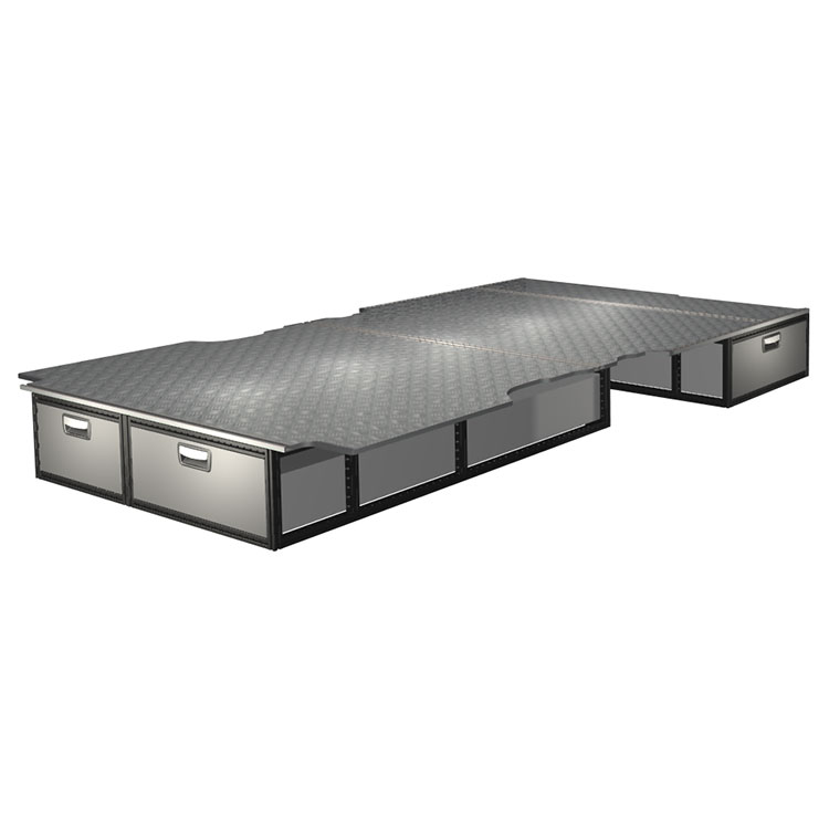 Kitet är designat för installation ovanpå ett Modul-Floor, där det undre golvets skenor nyttjas för en icke-förstörande installation. Dubbelgolvets skenor möjliggör enkelt montage av fordonsinredning och kantlister bidrar till en snygg finish.