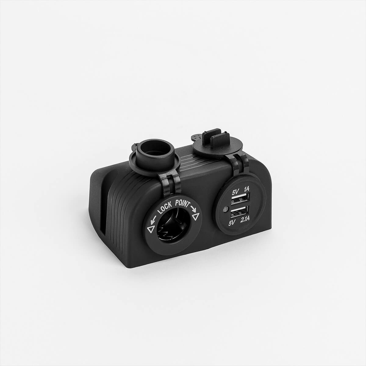 12 V dobbel stikkontakt med overflatemontert hus. Består av en nettstikkontakt og en USB-kontakt med to effekter (5 V 1 A / 2,1 A).