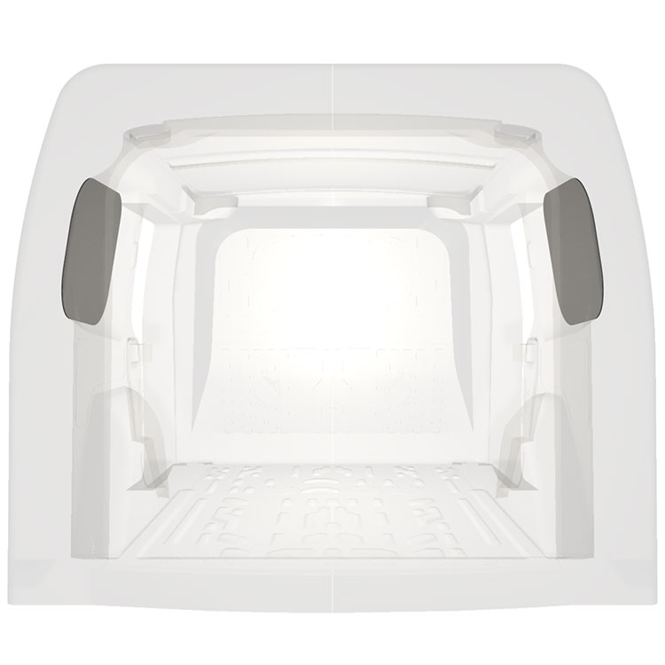 Lett prefabrikkertkledning til innerveggene i Opel Combo / Fiat Doblò med doble sidedører. Kledningen gir et lyst og trivelig arbeidsmiljø, og er enkel å tørke av.