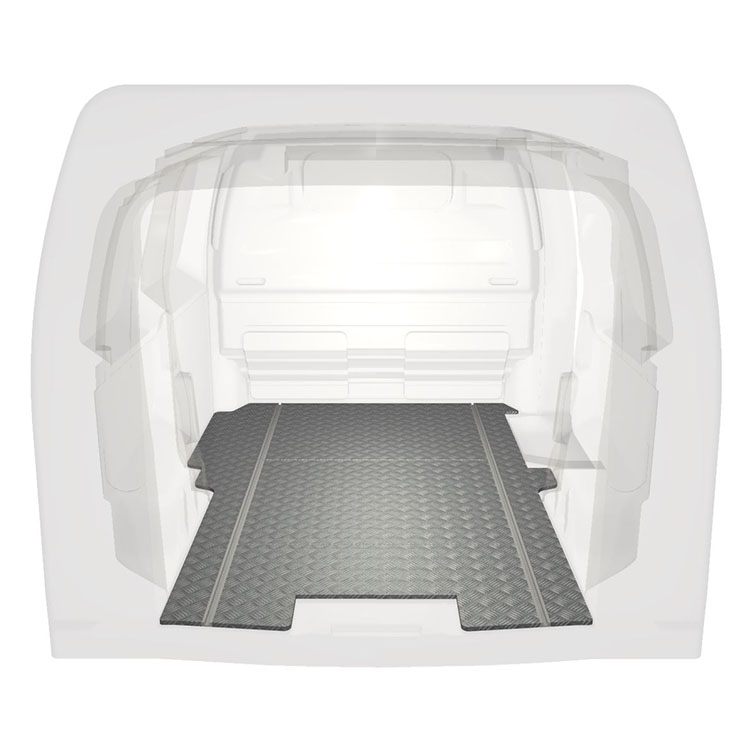 Lett og robust standard varebilgulv til Citroën Jumpy / Peugeot Expert / Toyota ProAce sklisikker tråplate i aluminium og lastskinner (langsgående) for rask og sikker installasjon av hyllesystemer og annet tilbehør.