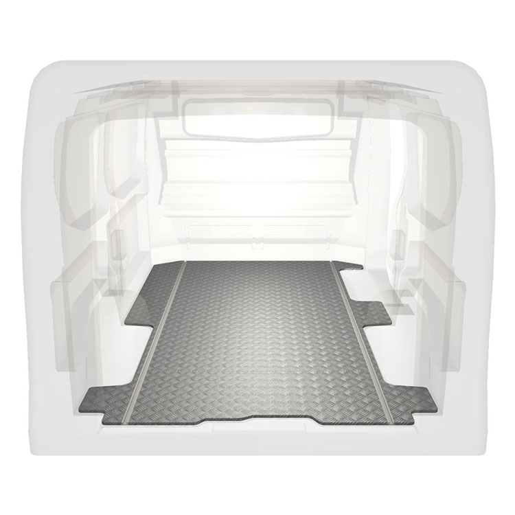 Lett og robust standard varebilgulv til Renault Trafic / Opel Vivaro / Fiat Talento / Nissan NV300 sklisikker tråplate i aluminium og lastskinner (langsgående) for rask og sikker installasjon av hyllesystemer og annet tilbehør.