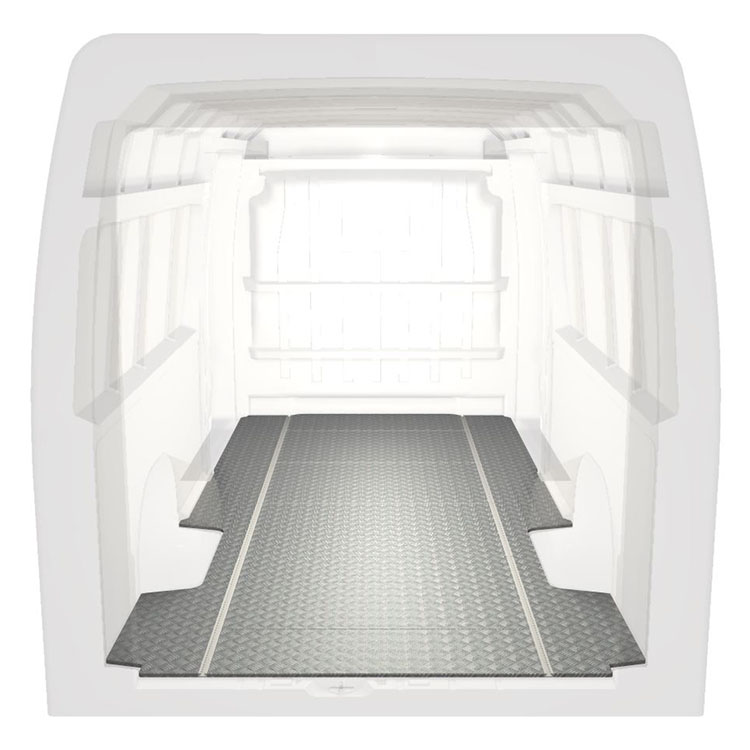 Lett og robust standard varebilgulv til Citroën Jumper / Peugeot Boxer / Fiat Ducato sklisikker tråplate i aluminium og lastskinner (langsgående) for rask og sikker installasjon av hyllesystemer og annet tilbehør.