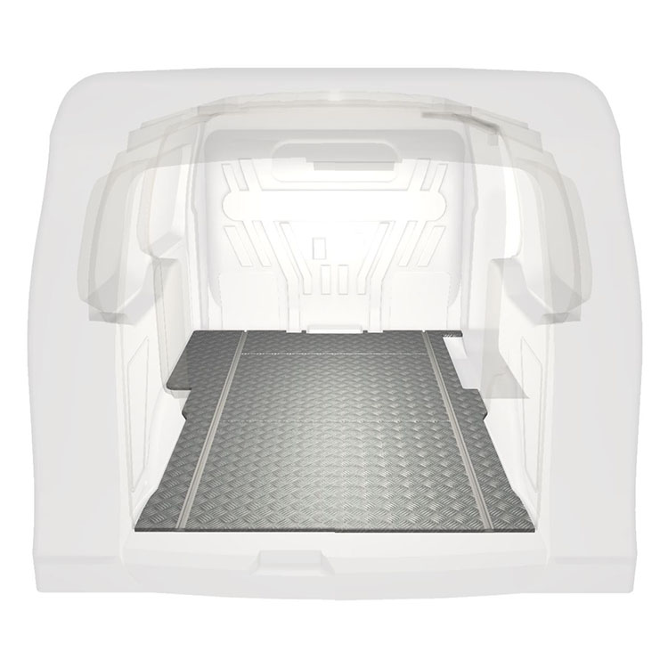 Lett og robust standard varebilgulv til Ford Transit Connect sklisikker tråplate i aluminium og lastskinner (langsgående) for rask og sikker installasjon av hyllesystemer og annet tilbehør.