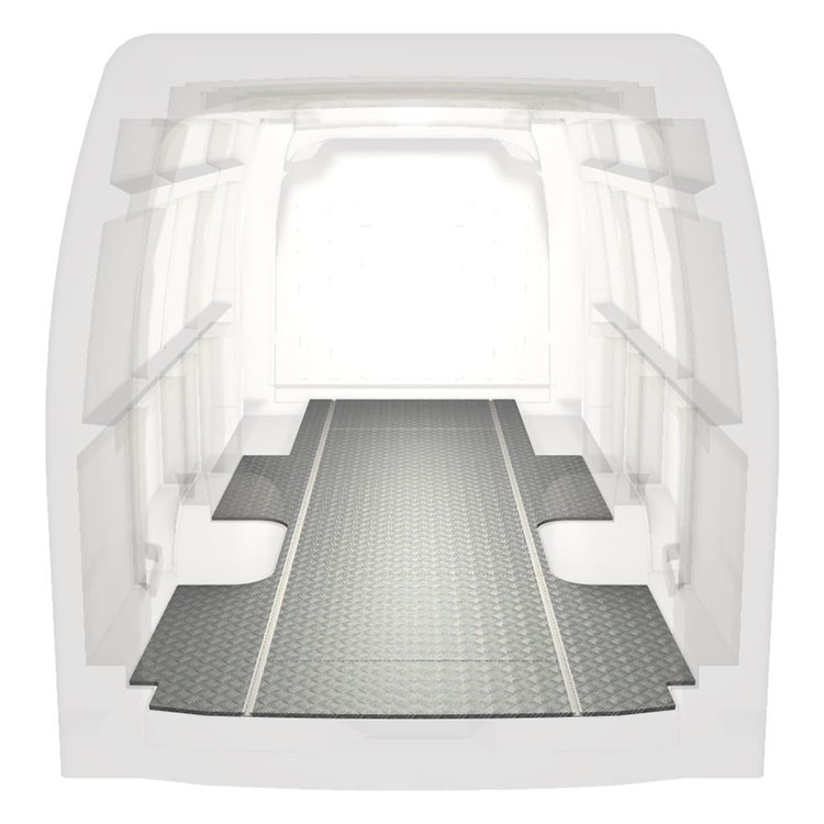 Lett og robust standard varebilgulv til Renault Master / Opel Movano / Nissan NV400 sklisikker tråplate i aluminium og lastskinner (langsgående) for rask og sikker installasjon av hyllesystemer og annet tilbehør.