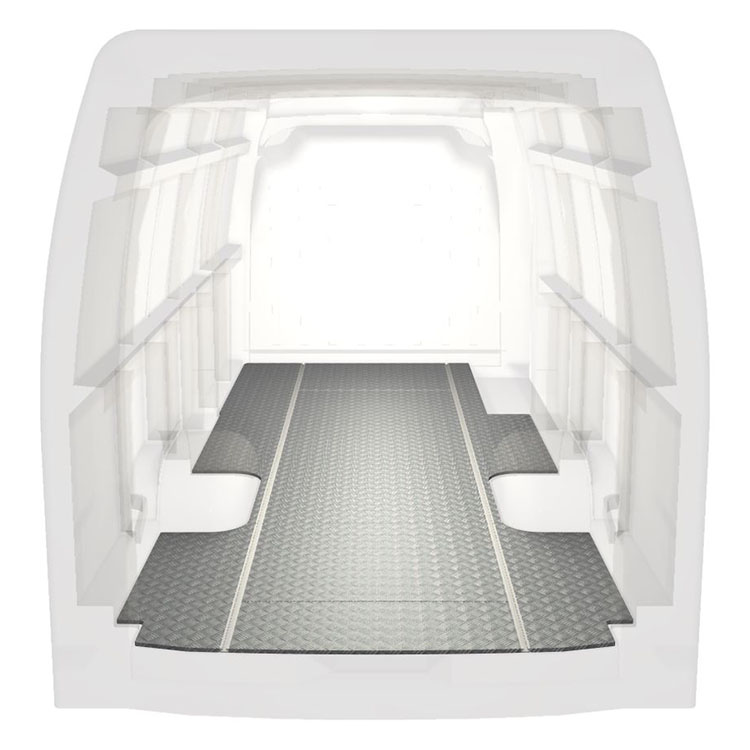 Lett og robust standard varebilgulv til Renault Master / Opel Movano / Nissan NV400 sklisikker tråplate i aluminium og lastskinner (langsgående) for rask og sikker installasjon av hyllesystemer og annet tilbehør.