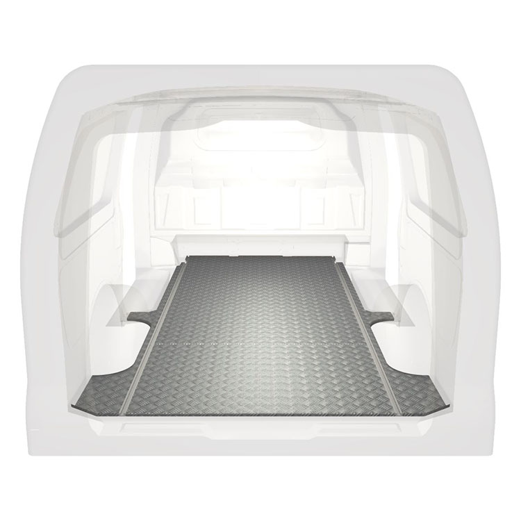 Lett og robust standard varebilgulv til Mercedes Vito sklisikker tråplate i aluminium og lastskinner (langsgående) for rask og sikker installasjon av hyllesystemer og annet tilbehør.