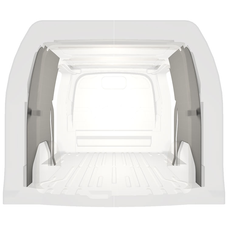 Lett full kledning til innerveggene i Ford Transit Custom med doble sidedører. Kledningen gir et lyst og trivelig arbeidsmiljø, og er enkel å tørke av.