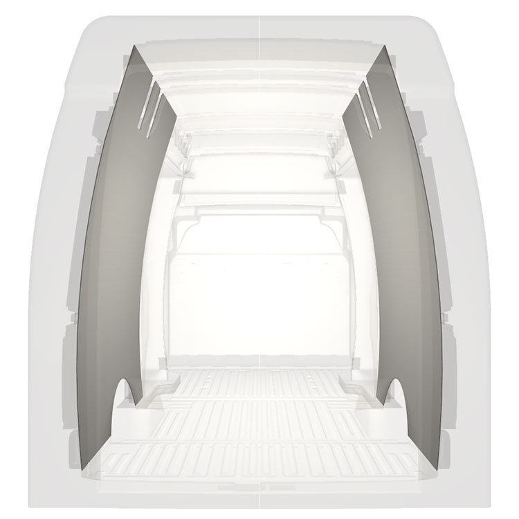 Lett full kledning til innerveggene i Iveco Daily med doble sidedører. Kledningen gir et lyst og trivelig arbeidsmiljø, og er enkel å tørke av.