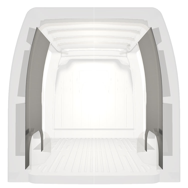 Lett full kledning til innerveggene i Renault Master / Opel Movano / Nissan NV400 med doble sidedører. Kledningen gir et lyst og trivelig arbeidsmiljø, og er enkel å tørke av.