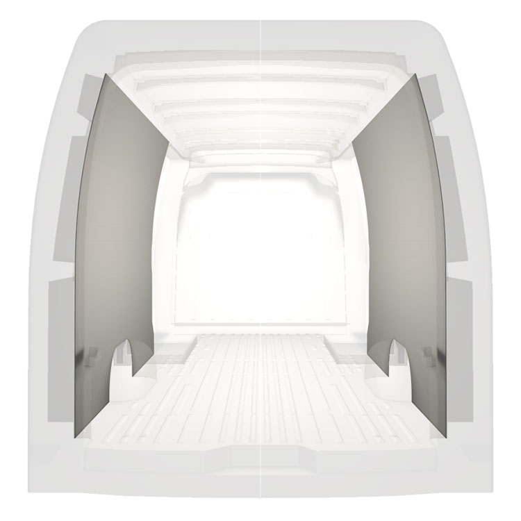 Lett full kledning til innerveggene i Renault Master / Opel Movano / Nissan NV400 med doble sidedører. Kledningen gir et lyst og trivelig arbeidsmiljø, og er enkel å tørke av.