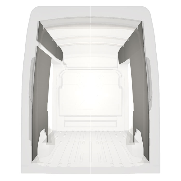 Lett full kledning til innerveggene i Ford Transit med doble sidedører. Kledningen gir et lyst og trivelig arbeidsmiljø, og er enkel å tørke av.