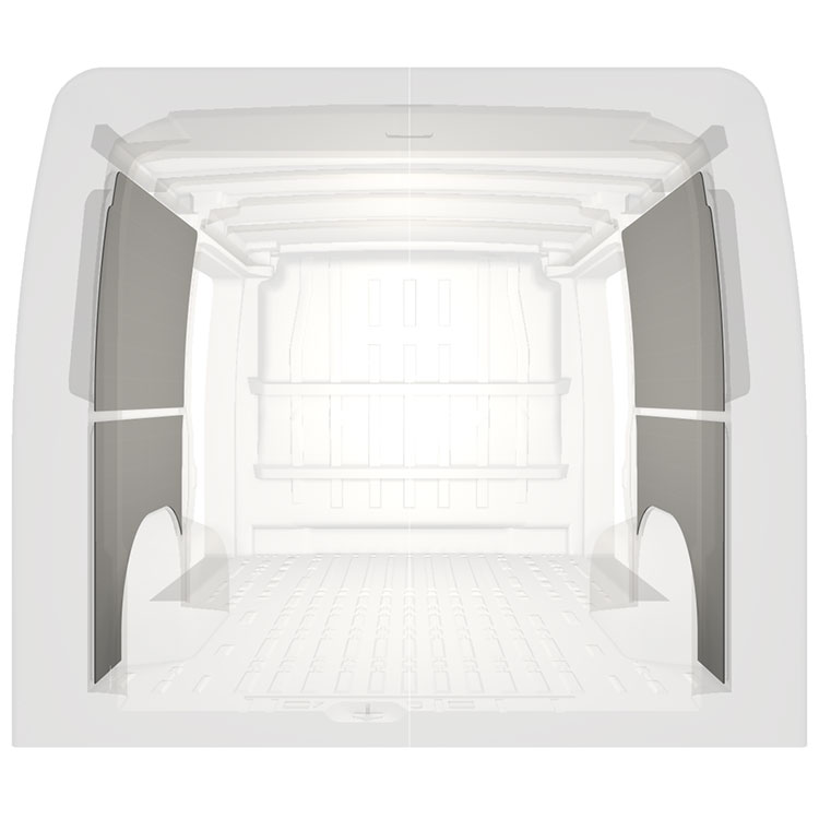 Lett prefabrikkertkledning til innerveggene i Citroën Jumper / Peugeot Boxer / Fiat Ducato med doble sidedører. Kledningen gir et lyst og trivelig arbeidsmiljø, og er enkel å tørke av.