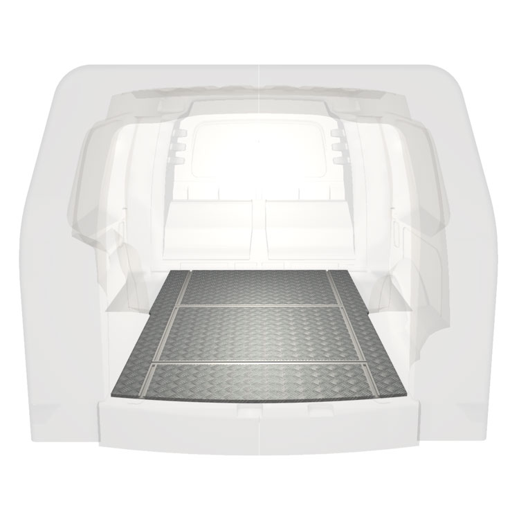 Lett og robust varebilgulv med tverrgående skinner til Volkswagen Caddy Cargo Maxi 21- med sklisikker tråplate i aluminium og lastskinner (langsgående og tverrgående) for rask og sikker installasjon av hyllesystemer og tilbehør.
