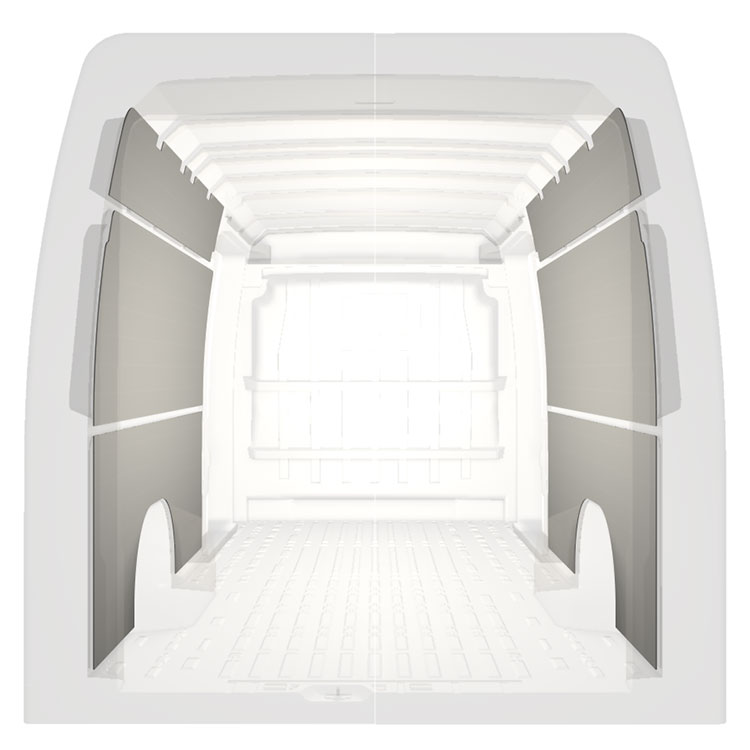 Lett prefabrikkertkledning til innerveggene i Citroën Jumper / Peugeot Boxer / Fiat Ducato med doble sidedører. Kledningen gir et lyst og trivelig arbeidsmiljø, og er enkel å tørke av.