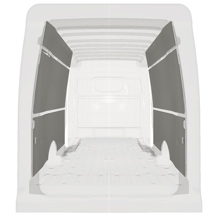 Lett prefabrikkertkledning til innerveggene i Volkswagen Crafter / MAN TGE med doble sidedører. Kledningen gir et lyst og trivelig arbeidsmiljø, og er enkel å tørke av.