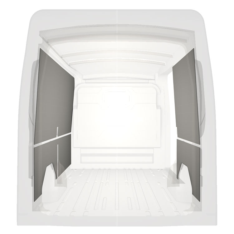 Lett panelkledning til innerveggene i Ford Transit med høyre sidedør. Kledningen gir et lyst og trivelig arbeidsmiljø, og er enkel å tørke av.