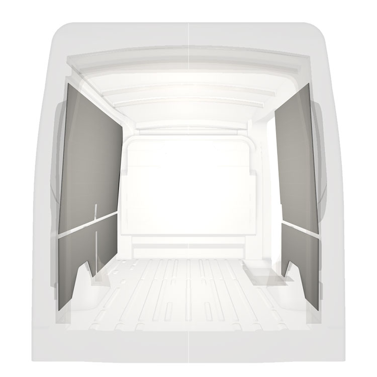 Lett panelkledning til innerveggene i Ford Transit med høyre sidedør. Kledningen gir et lyst og trivelig arbeidsmiljø, og er enkel å tørke av.