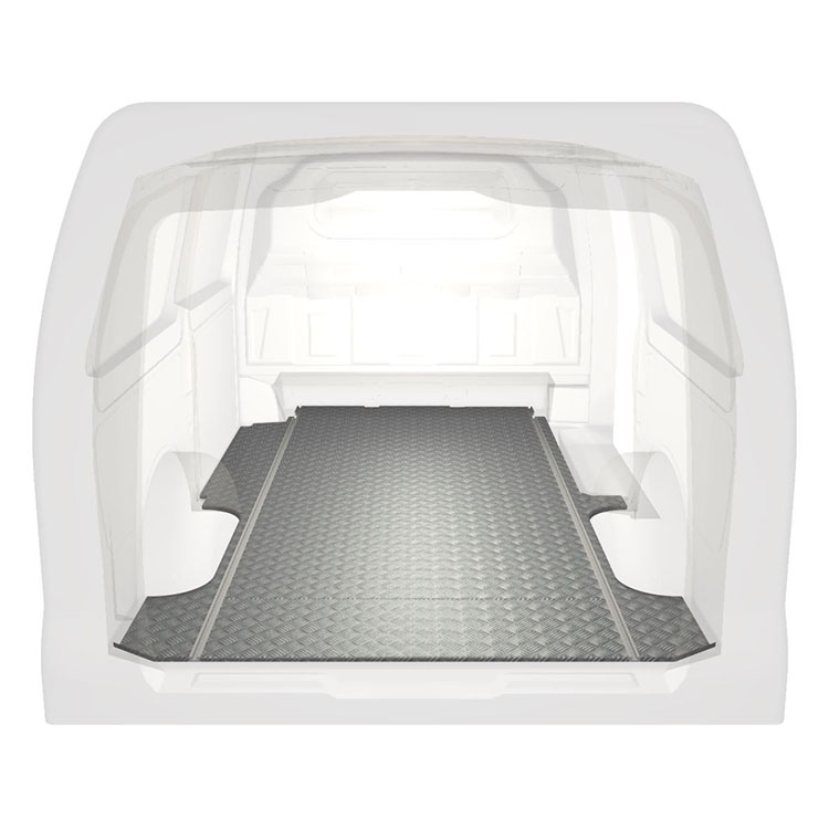 Lett og robust ekstra langt gulv til Mercedes Vito med sklisikker tråplate i aluminium og lastskinner (langsgående) for rask og sikker installasjon av hyllesystemer og annet tilbehør.