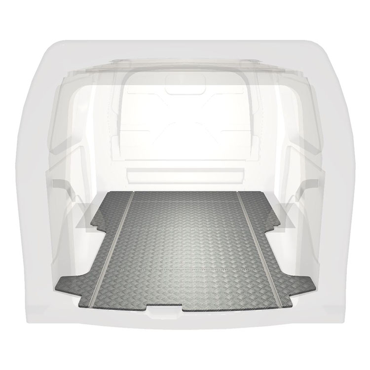Lett og robust standard varebilgulv til Ford Transit Custom sklisikker tråplate i aluminium og lastskinner (langsgående) for rask og sikker installasjon av hyllesystemer og annet tilbehør.