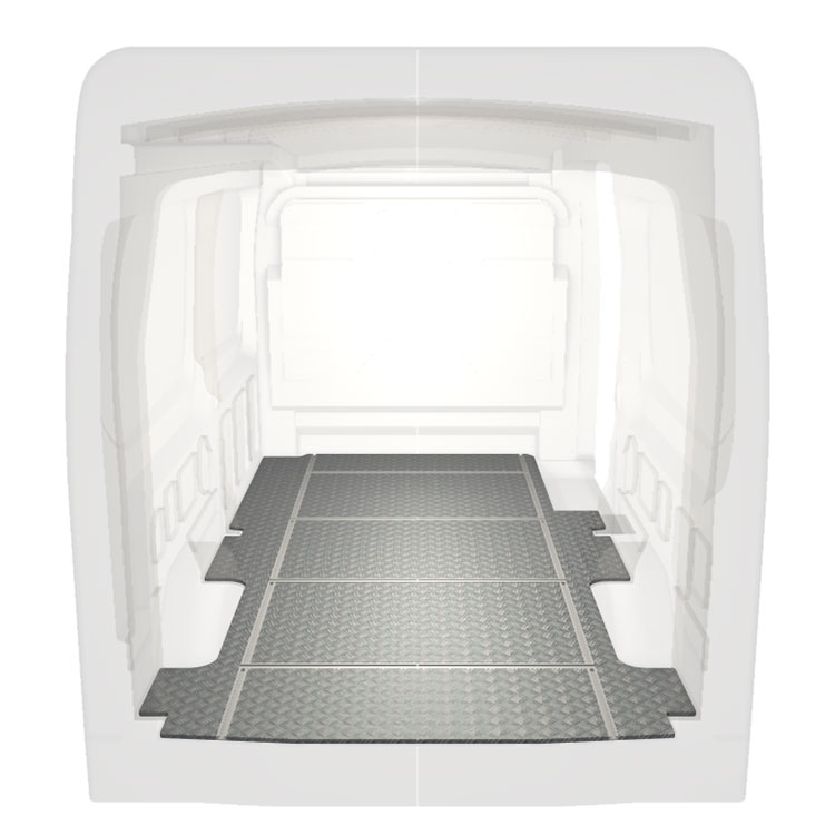 Lett og robust varebilgulv med tverrgående skinner til Ford Transit med sklisikker tråplate i aluminium og lastskinner (langsgående og tverrgående) for rask og sikker installasjon av hyllesystemer og tilbehør.