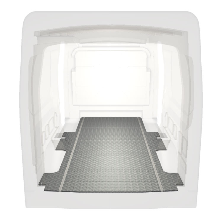 Lett og robust standard varebilgulv til Ford Transit sklisikker tråplate i aluminium og lastskinner (langsgående) for rask og sikker installasjon av hyllesystemer og annet tilbehør.