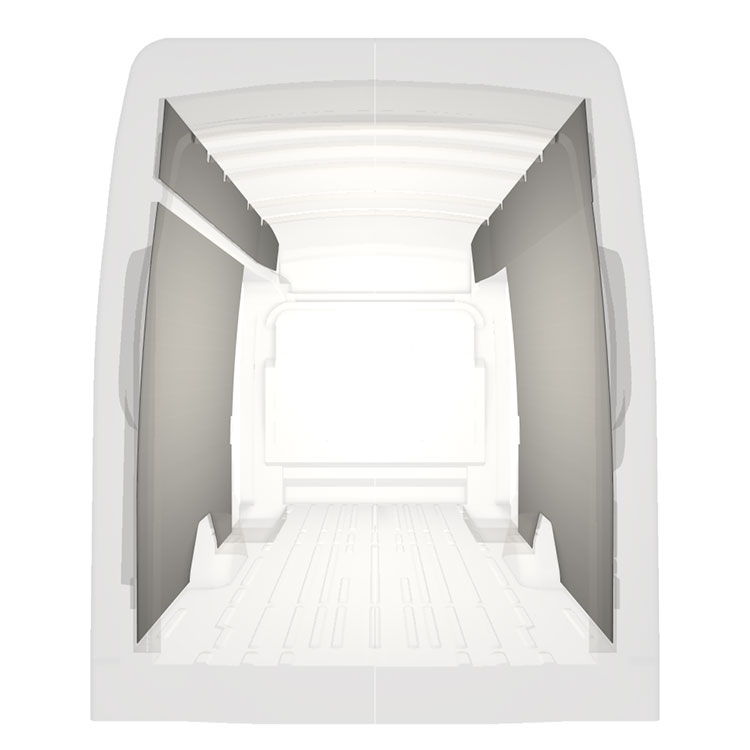 Lett full kledning til innerveggene i Ford Transit med doble sidedører. Kledningen gir et lyst og trivelig arbeidsmiljø, og er enkel å tørke av.