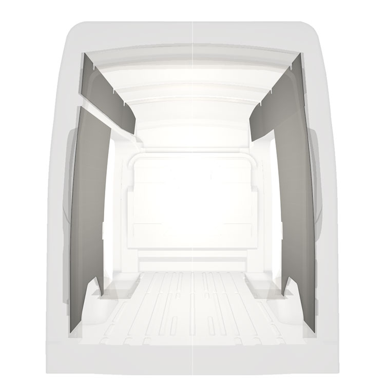 Lett full kledning til innerveggene i Ford Transit med doble sidedører. Kledningen gir et lyst og trivelig arbeidsmiljø, og er enkel å tørke av.