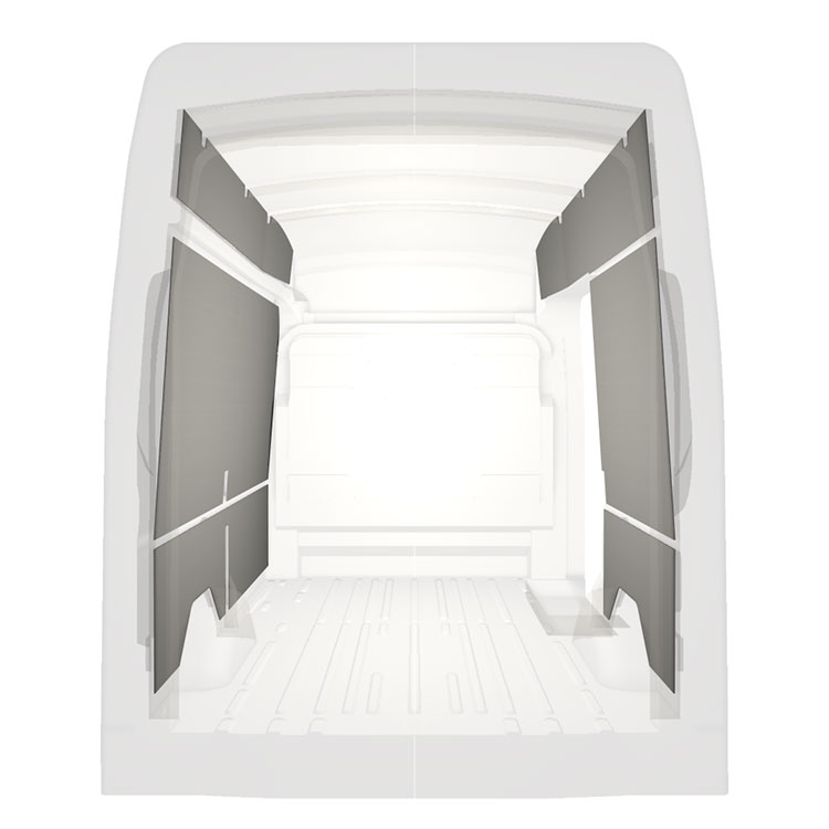 Lett panelkledning til innerveggene i Ford Transit med høyre sidedør. Kledningen gir et lyst og trivelig arbeidsmiljø, og er enkel å tørke av.