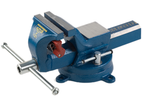 Smitt skruvstycke av stål med käftbredd 120 mm. Vridplatta, som medger vridning 360 grader, och integrerad rörback ingår. Kan även kompletteras med skyddsback.
