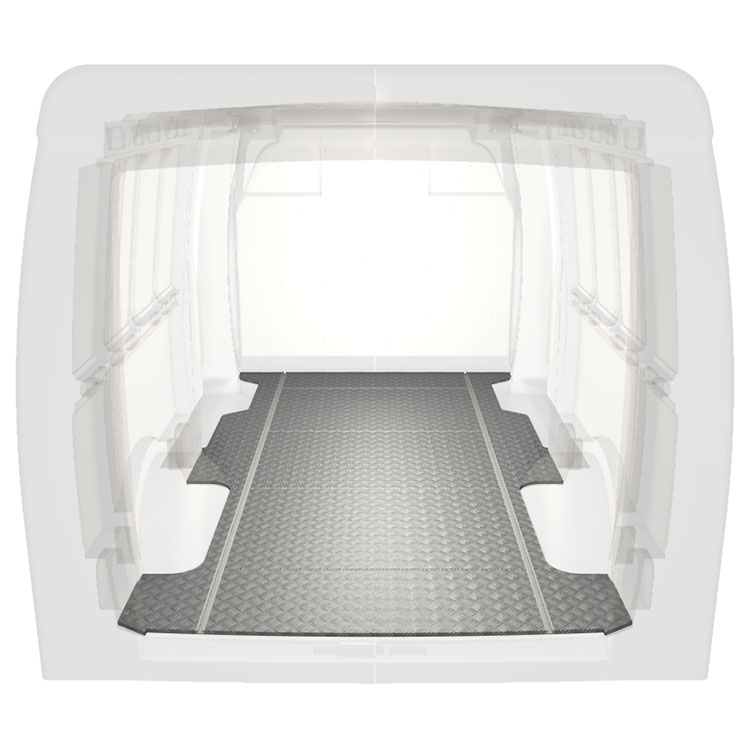Lett og robust standard varebilgulv til Iveco Daily sklisikker tråplate i aluminium og lastskinner (langsgående) for rask og sikker installasjon av hyllesystemer og annet tilbehør.