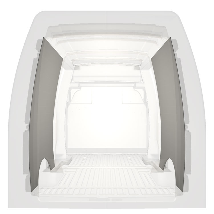 Lett full kledning til innerveggene i Iveco Daily med doble sidedører. Kledningen gir et lyst og trivelig arbeidsmiljø, og er enkel å tørke av.