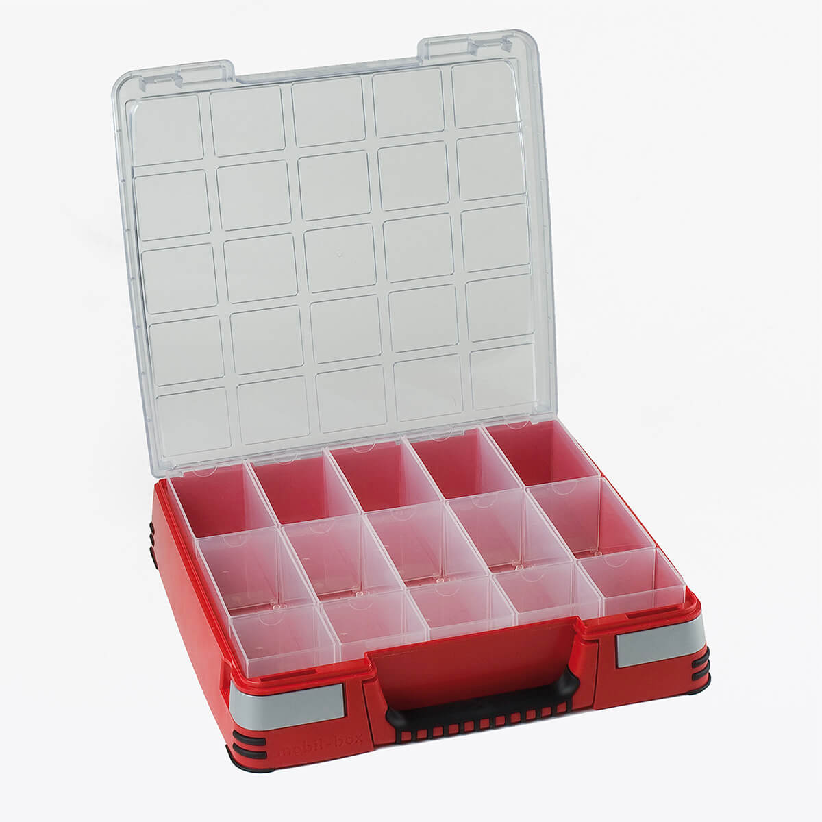 Mobil-Box er en praktisk og mobil oppbevaringsveske med et attraktivt design og modulbaserte innlegg. Den er lett å bære, smidig og svært slagfast. Gummikledde hjørner og håndtak gir ekstra grep og beskyttelse, og materialet tåler de fleste oljer, syrer og kjemikalier.