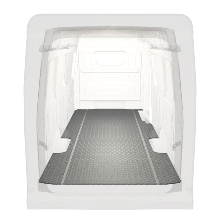 Lett og robust standard varebilgulv til Volkswagen Crafter / MAN TGE sklisikker tråplate i aluminium og lastskinner (langsgående) for rask og sikker installasjon av hyllesystemer og annet tilbehør.