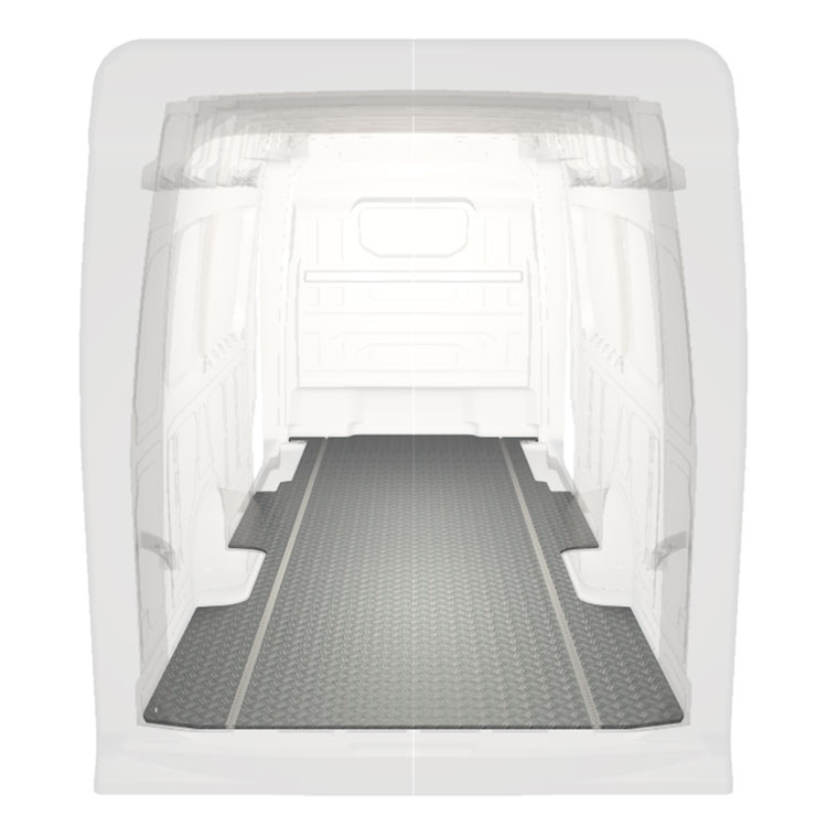 Lett og robust ekstra langt gulv til Volkswagen Crafter / MAN TGE med sklisikker tråplate i aluminium og lastskinner (langsgående) for rask og sikker installasjon av hyllesystemer og annet tilbehør.