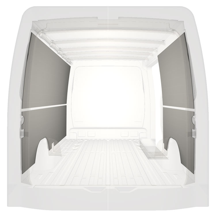 Lett panelkledning til innerveggene i Mercedes Sprinter med høyre sidedør. Kledningen gir et lyst og trivelig arbeidsmiljø, og er enkel å tørke av.