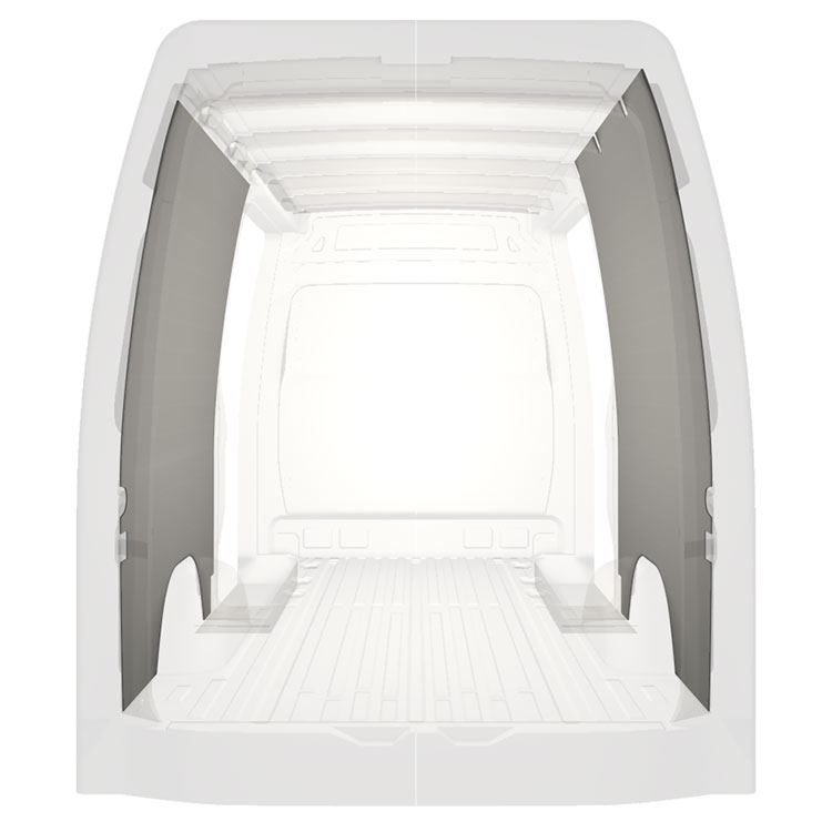 Lett full kledning til innerveggene i Mercedes Sprinter med doble sidedører. Kledningen gir et lyst og trivelig arbeidsmiljø, og er enkel å tørke av.