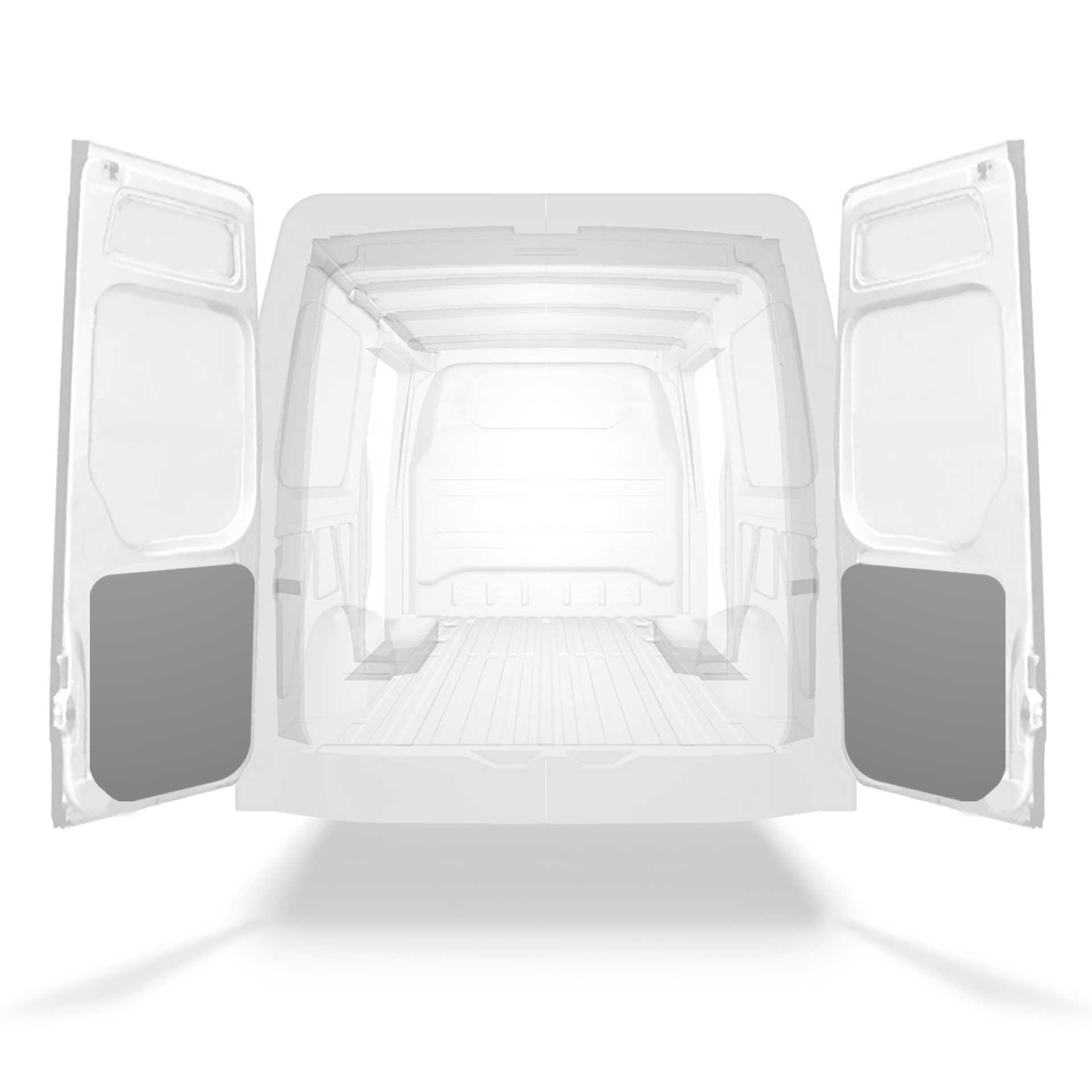 Lett nedre panelkledning til bakdør i Mercedes Sprinter med dobbeltdører. Dørkledningen har en design som gir en profesjonell utførelse på innsiden, den beskytter varebilen og er enkel å tørke av.