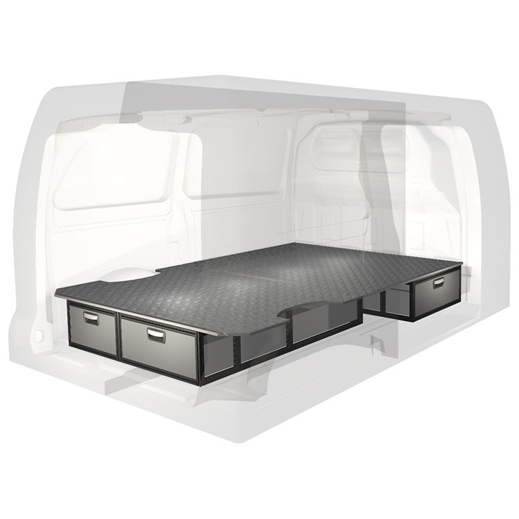Kitet är designat för installation ovanpå ett trägolv. Dubbelgolvets skenor möjliggör enkelt montage av fordonsinredning och kantlister bidrar till en snygg finish.