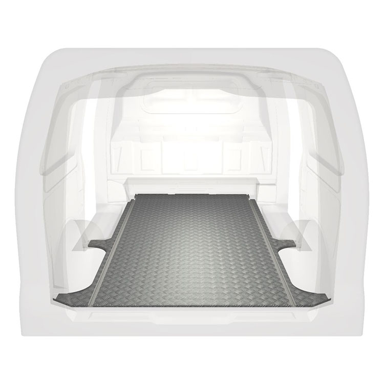 Lett og robust ekstra langt gulv til Mercedes Vito med sklisikker tråplate i aluminium og lastskinner (langsgående) for rask og sikker installasjon av hyllesystemer og annet tilbehør.