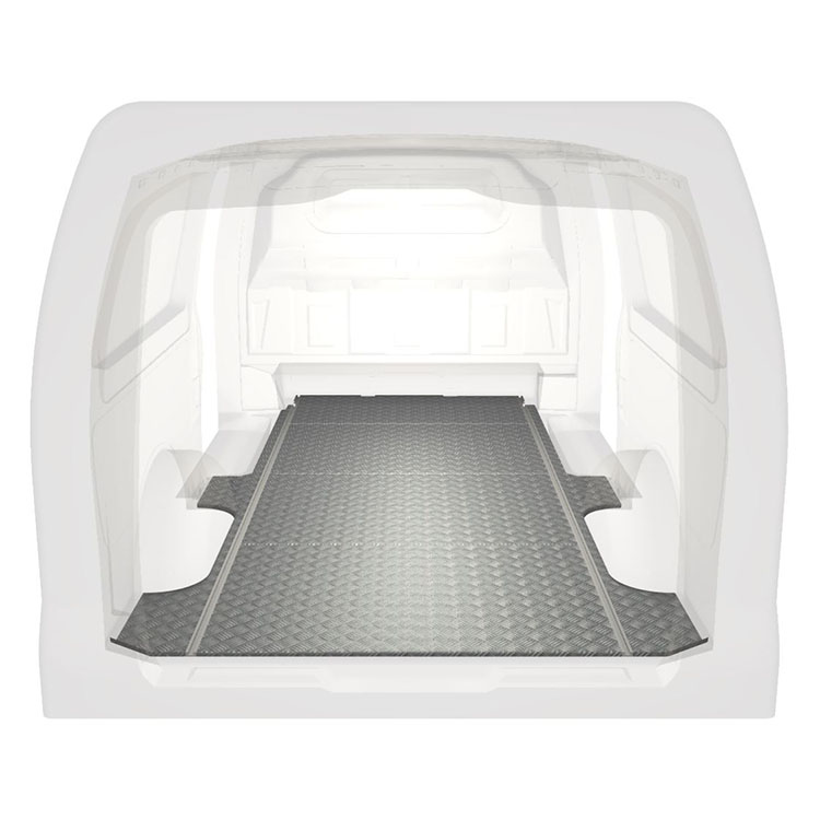 Lett og robust standard varebilgulv til Mercedes Vito sklisikker tråplate i aluminium og lastskinner (langsgående) for rask og sikker installasjon av hyllesystemer og annet tilbehør.