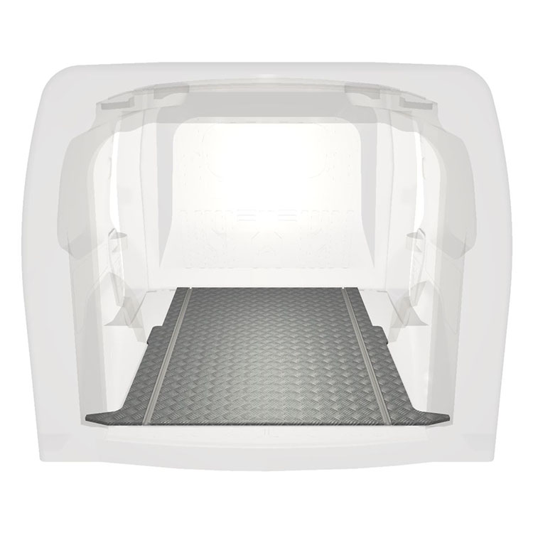 Lett og robust ekstra langt gulv til Opel Combo / Fiat Doblò med sklisikker tråplate i aluminium og lastskinner (langsgående) for rask og sikker installasjon av hyllesystemer og annet tilbehør.