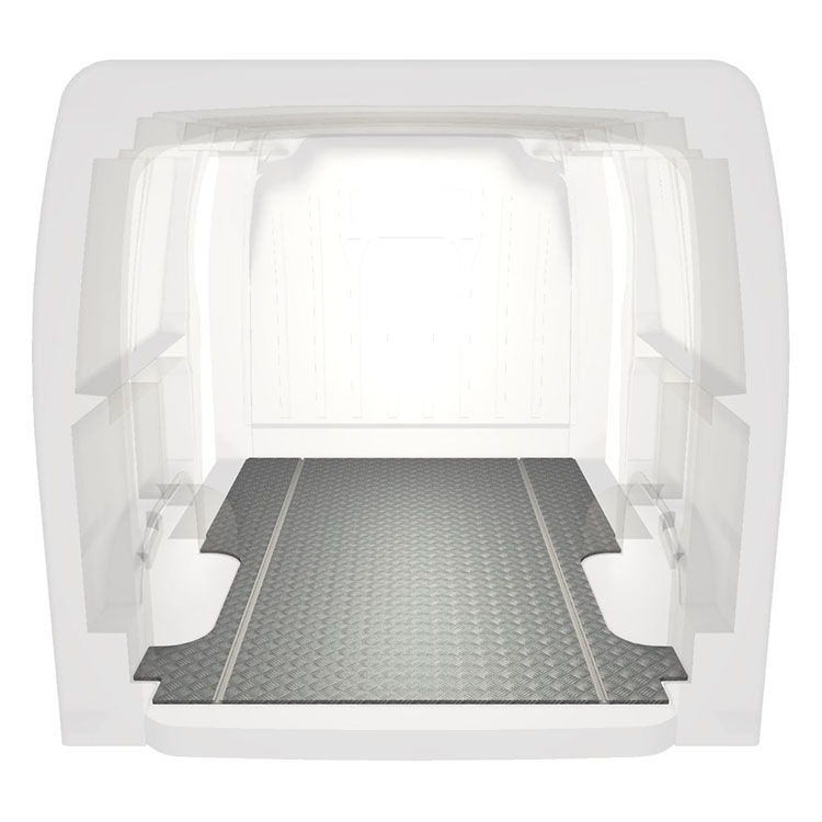 Lett og robust ekstra langt gulv til Renault Master / Opel Movano / Nissan NV400 med sklisikker tråplate i aluminium og lastskinner (langsgående) for rask og sikker installasjon av hyllesystemer og annet tilbehør.