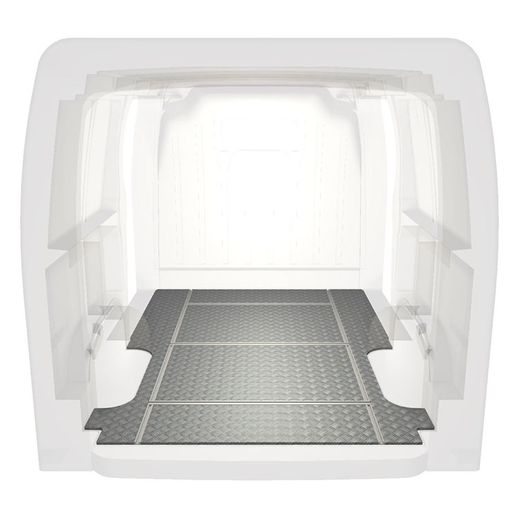 Lett og robust varebilgulv med tverrgående skinner til Renault Master / Opel Movano / Nissan NV400 med sklisikker tråplate i aluminium og lastskinner (langsgående og tverrgående) for rask og sikker installasjon av hyllesystemer og tilbehør.