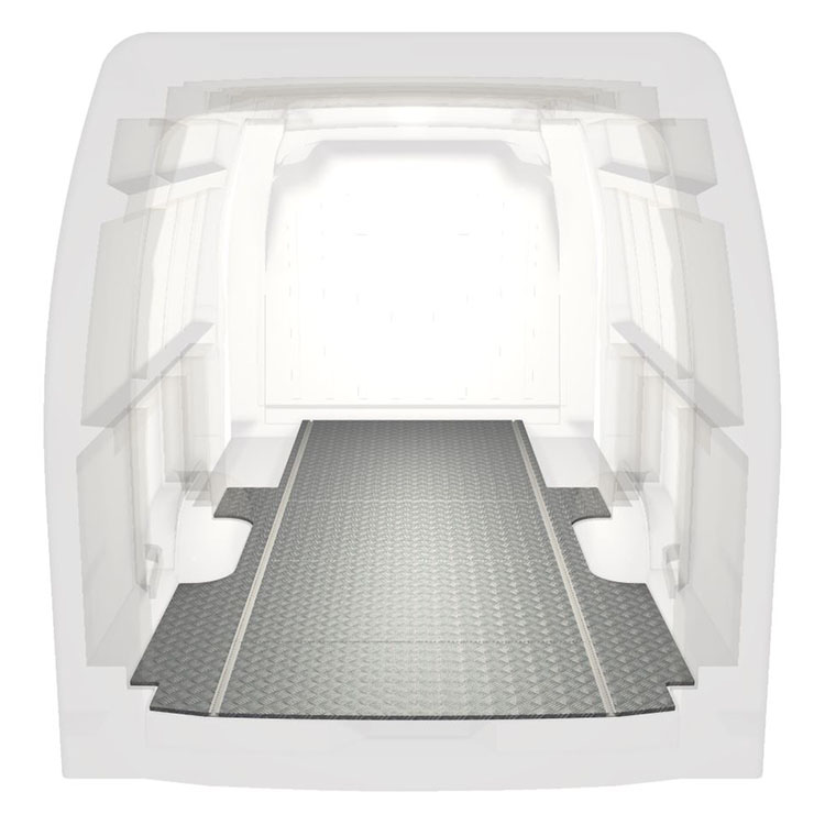 Lett og robust standard varebilgulv til Renault Master / Opel Movano / Nissan NV400 sklisikker tråplate i aluminium og lastskinner (langsgående) for rask og sikker installasjon av hyllesystemer og annet tilbehør.