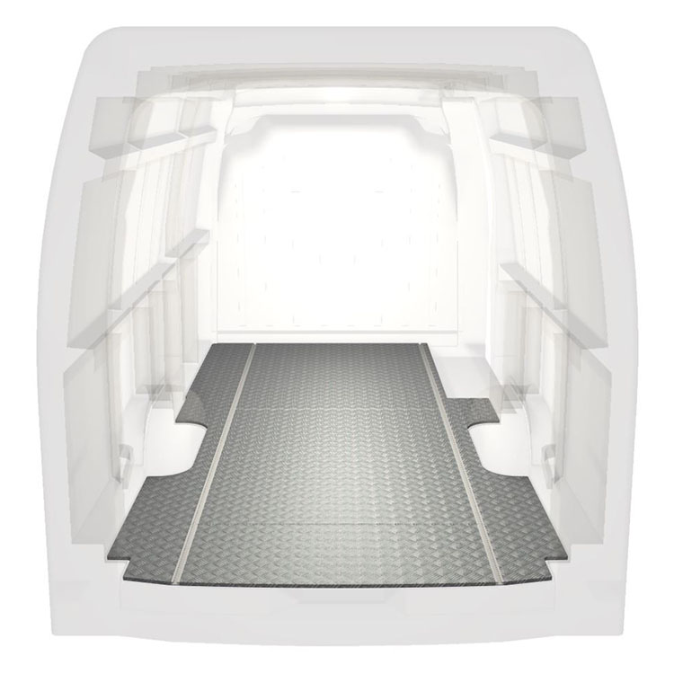 Lett og robust standard varebilgulv til Renault Master / Opel Movano / Nissan NV400 sklisikker tråplate i aluminium og lastskinner (langsgående) for rask og sikker installasjon av hyllesystemer og annet tilbehør.