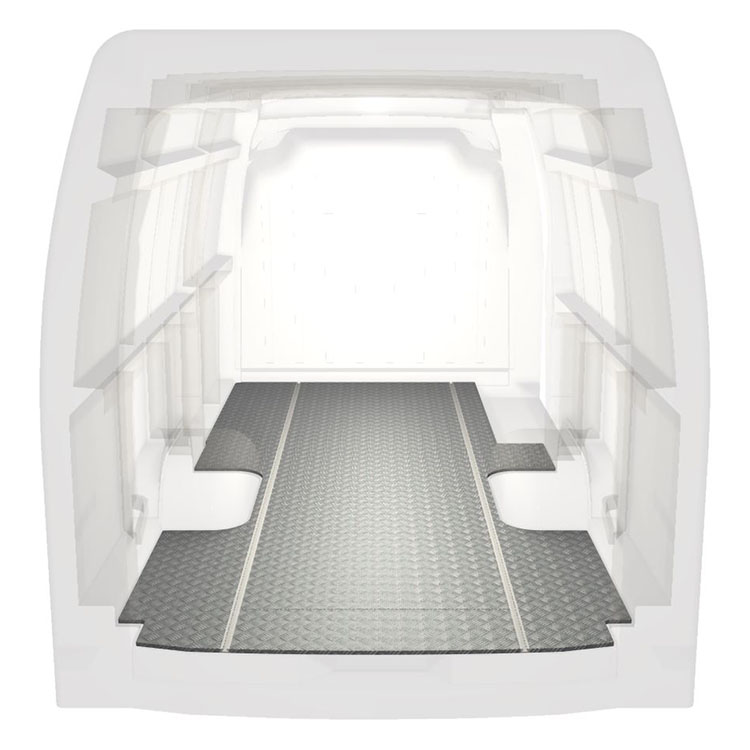 Lett og robust ekstra langt gulv til Renault Master / Opel Movano / Nissan NV400 med sklisikker tråplate i aluminium og lastskinner (langsgående) for rask og sikker installasjon av hyllesystemer og annet tilbehør.