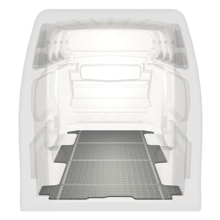 Lett og robust varebilgulv med tverrgående skinner til Renault Trafic / Opel Vivaro / Fiat Talento / Nissan NV300 med sklisikker tråplate i aluminium og lastskinner (langsgående og tverrgående) for rask og sikker installasjon av hyllesystemer og tilbehør.